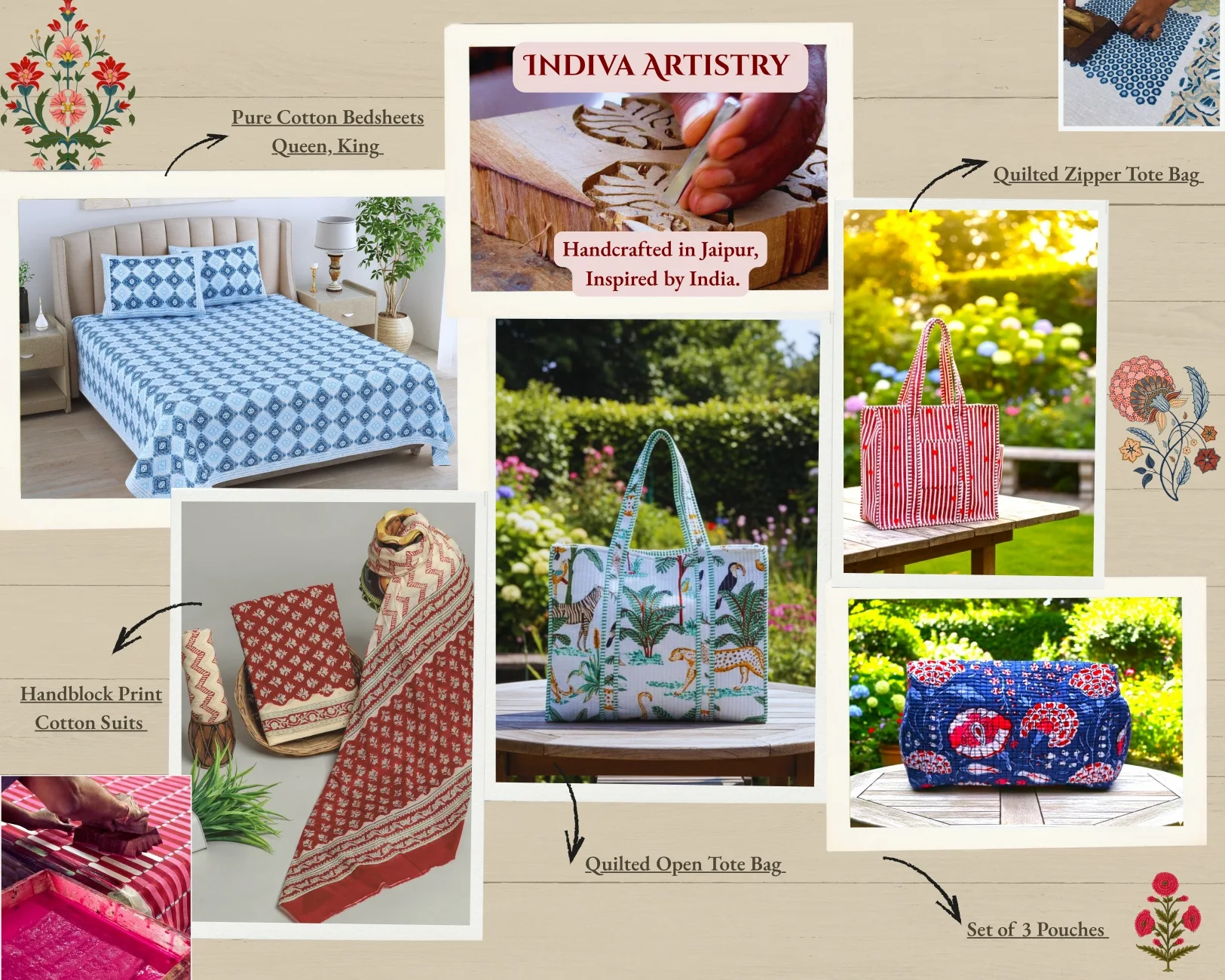 Each product at Indiva Krafts is made with 100% pure cotton, designed to bring comfort, elegance, and authenticity into your everyday life. Our artisans use age-old handblock printing techniques, creating unique patterns and vibrant hues that tell stories of tradition, artistry, and love for handmade creations.