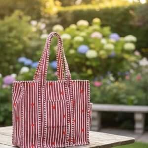 The charming red-and-white striped pattern, sprinkled with tiny red hearts, gives it a fresh and cheerful look—ideal for casual outings,
