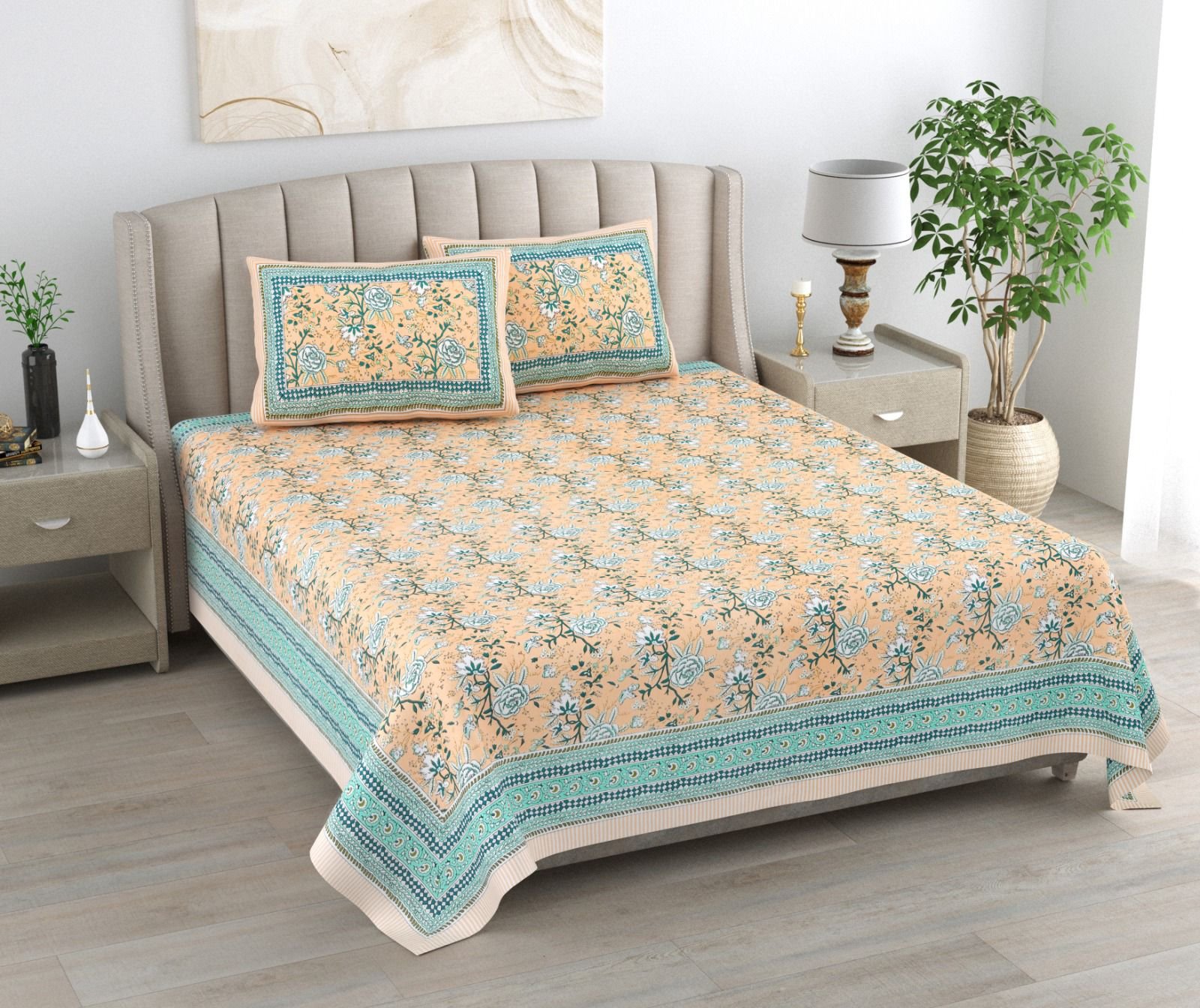 Add soft elegance to your bedroom with our Kaya Queen Size Bedsheet, crafted in Jaipur, Raj. Made from 100% pure cotton, this bedsheet features a soothing blend of Floral peach and orange tones that bring warmth and charm to your space. Perfect for daily use, with a smooth, breathable feel that keeps you comfortable all night.
