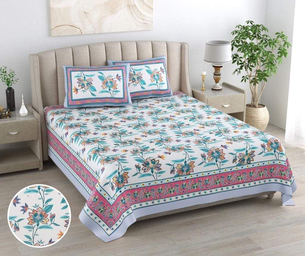 Give your bedroom a fresh, elegant look with our Pure Cotton Queen Size Bedsheet, crafted in Jaipur, Raj. Designed on a clean white base with soft blue and pink floral patterns, this bedsheet brings a soothing, graceful, and timeless charm to your space. Made from breathable pure cotton for all-day comfort.