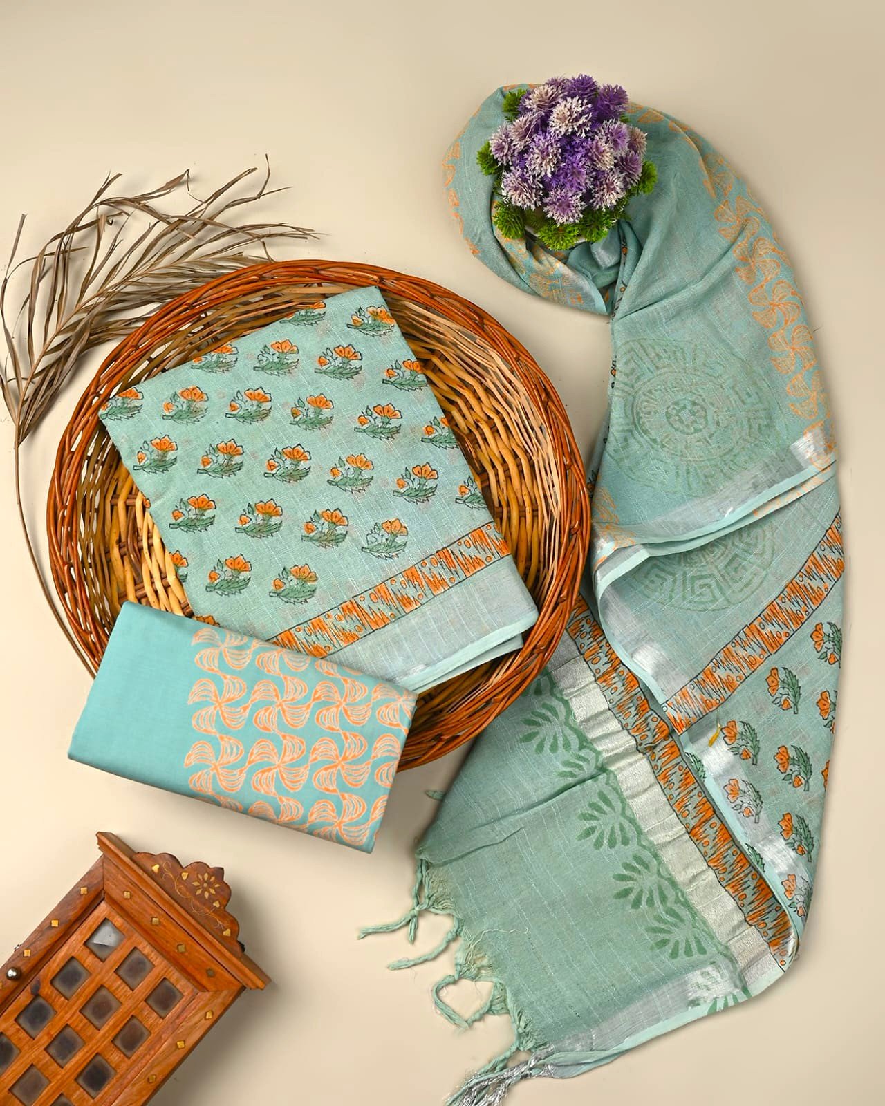Unstitched Hand block Cotton Suit with Linen Dupatta